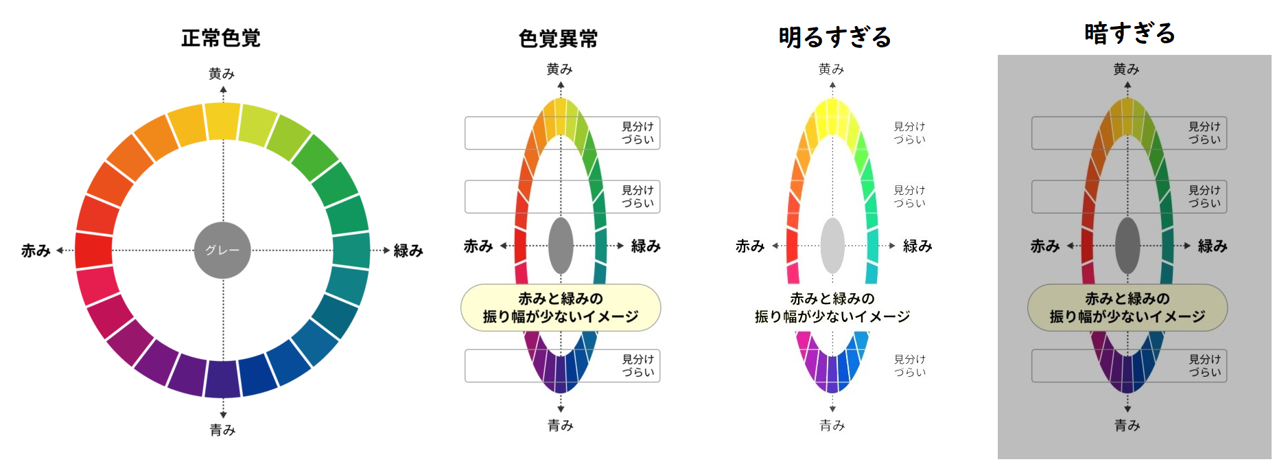 視力条件と同じように、明暗でも見えにくさが変わります。明るすぎても極端な話、黄色と白が見分けづらくなりますし、暗いと青と黒が同じに見えます。ただし明暗で色の判断がしにくくなるのは色覚異常じゃなくても一緒ですが。