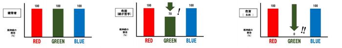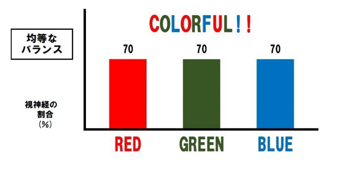 まず正常な人。日本人の97.5%はこんな感じでRGBの神経が均等にあると思ってください。本当は違いますけど。